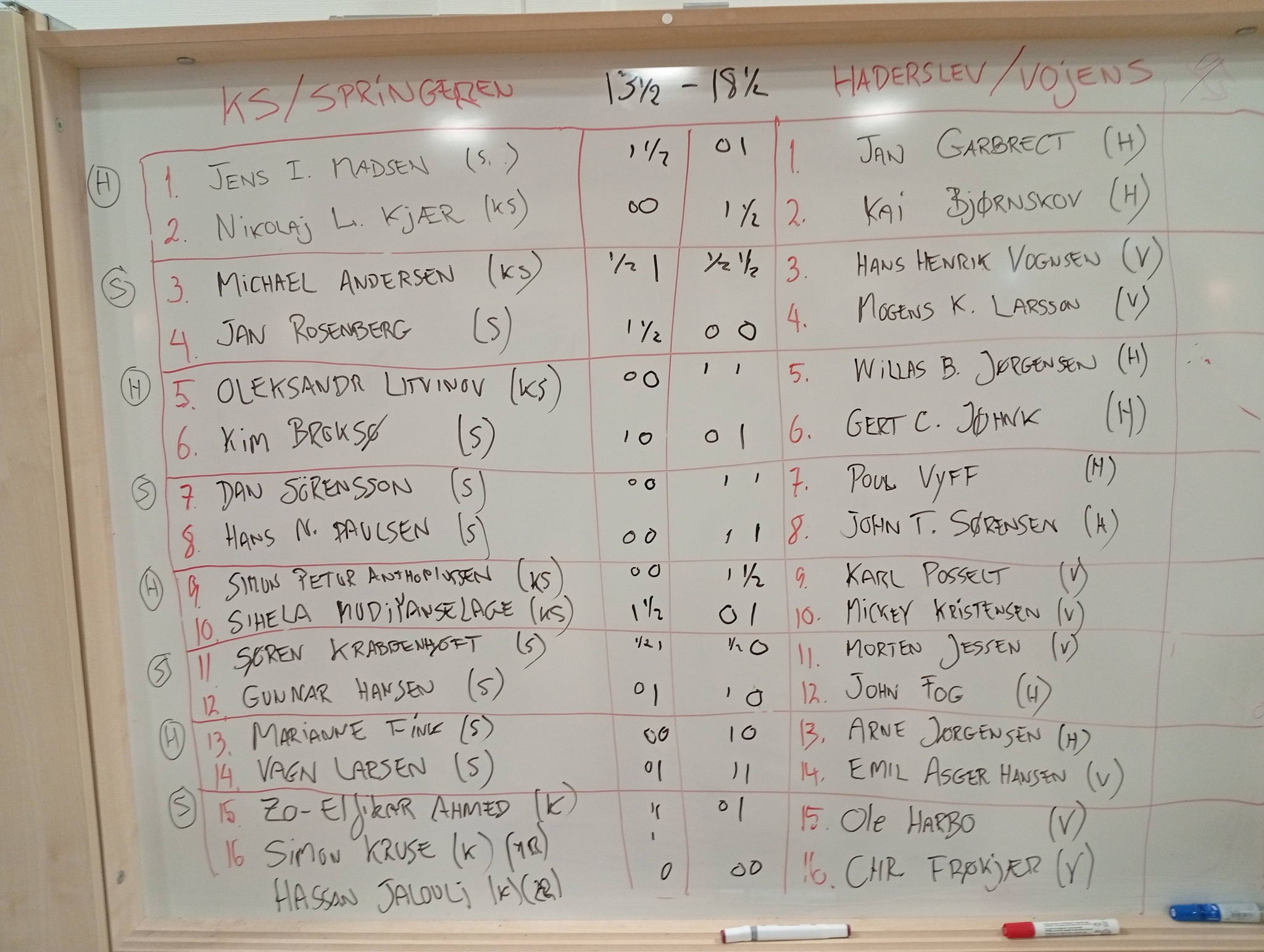 Det rent sportslige foregik på 16 brætter og for anden gang i træk måtte vi ned mod nakken. Brætscoren var med 18½-13½ dog ikke helt så grel som i 2025. Vojens/Haderslev udligner til 2-2 i det samlede regnskab, og vi går i boks om hvordan vi kan vende stærkere tilbage næste år hvor Haderslev er værter.